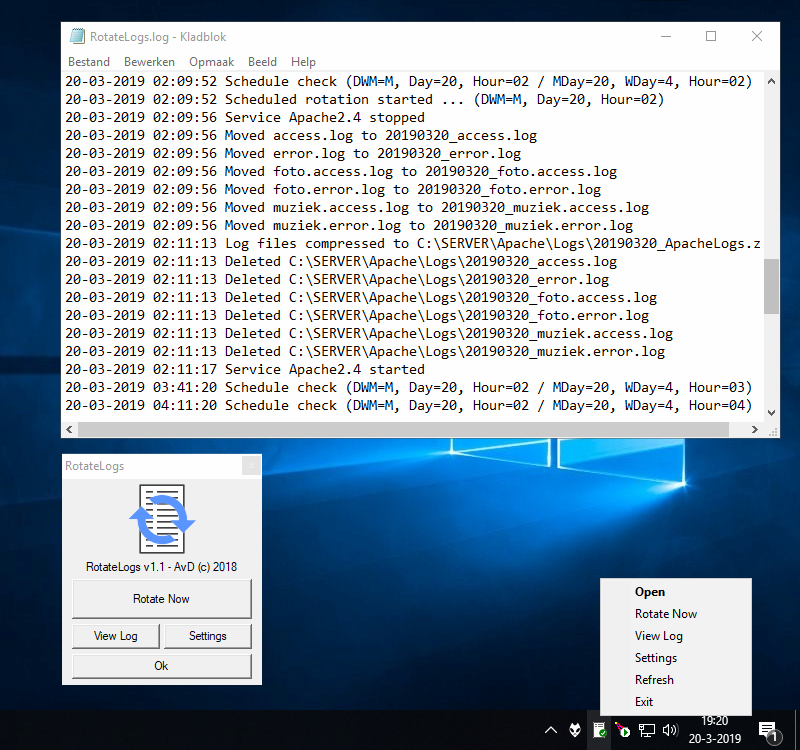 RotateLogs automatically stops the Apache HTTPD service, renames the log files by adding the date in front of the filename, archives the log files into a compressed file using the commandline version of 7Zip (included) and restarts the Apache HTTPD service. All this following a predefined schedule or manually from the Windows system tray menu.
