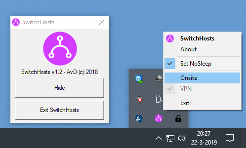 Tool to switch the Windows HOSTS file for VPN connections using IP translation. It can hold several HOSTS settings which can be switched from the system tray by clicking the SwitchHosts icon. |